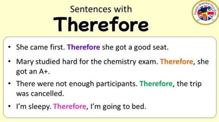 "He is crying; therefore he must be hurting." "I think I've stayed too long; therefore I'm leaving in the morning." "He worked the hardest; therefore he got the promotion." "I got there really early; therefore I was first in line."