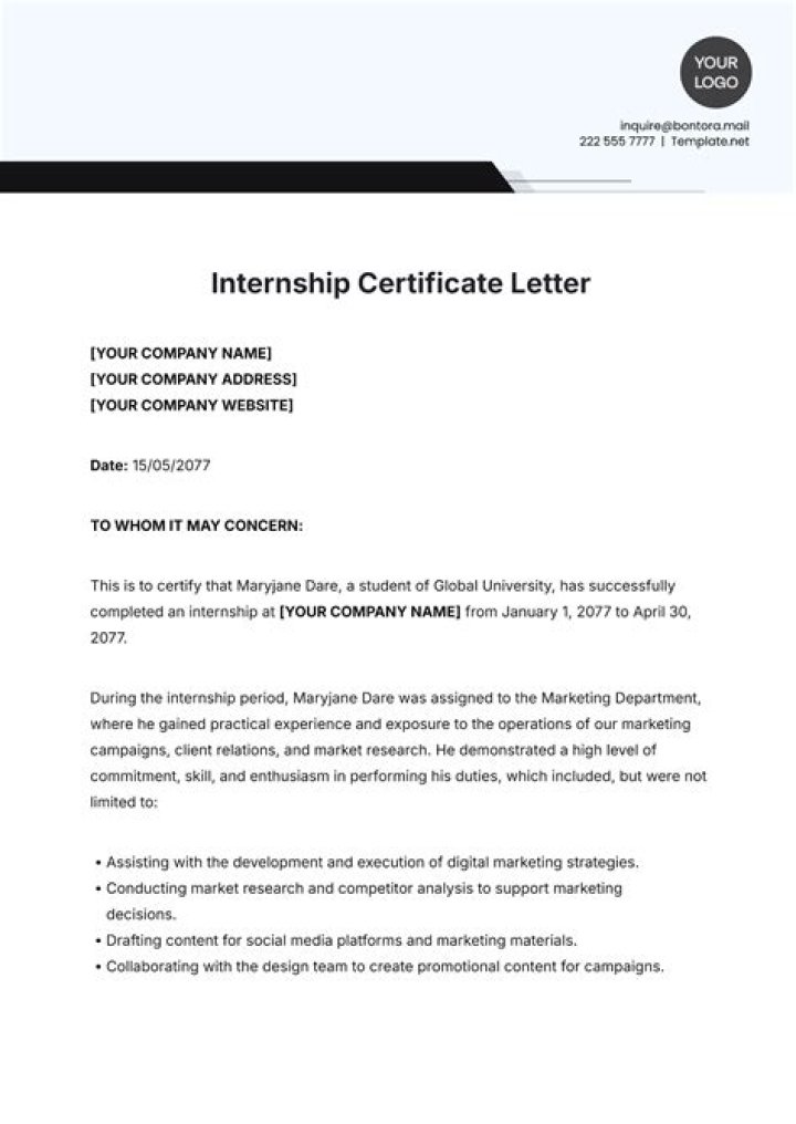 This is to certify that [Name of intern] has done his/her internship in [Designation of internship] at [company name], Bangalore, from [Start date] to [End date]. He/She has worked on a project titled [Name of the project]. This project was aimed at [purpose of the project].