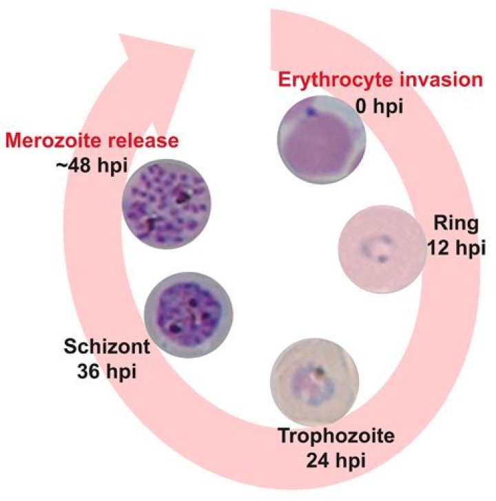 Upon release, the merozoites invade the red blood cells where they undergo another asexual cycle called erythrocytic schizogony. This is also known as the erythrocytic cycle. During this stage the merozoites develop to form immature or ring stage trophozoites which then progress to mature trophozoites.
