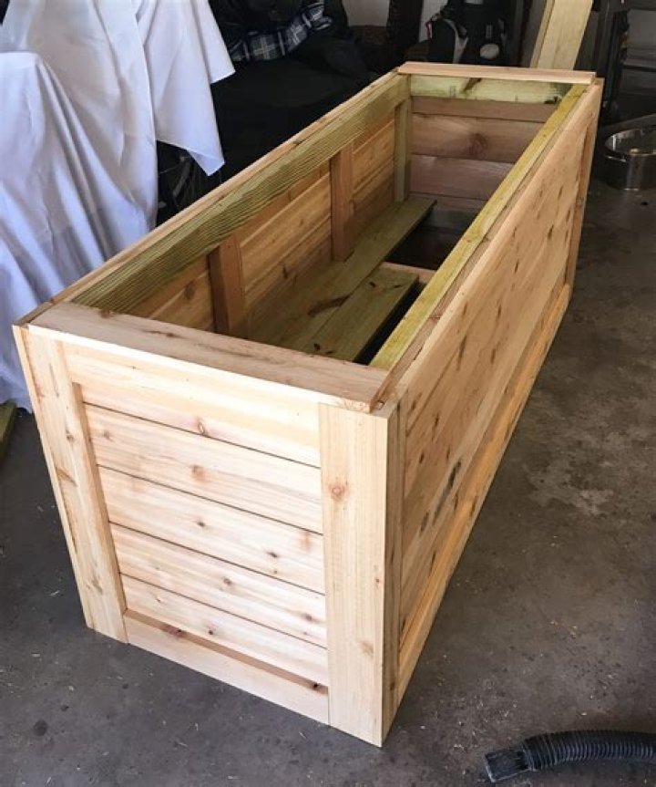 To protect the wood, line the planter inside with plastic, such as old plastic compost bags, fixing it with small nails. Make drainage holes before filling it with compost.