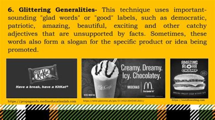 Using them has been described as "name-calling in reverse." Examples of words commonly employed as glittering generalities in political discourse include freedom, security, tradition, change, and prosperity.