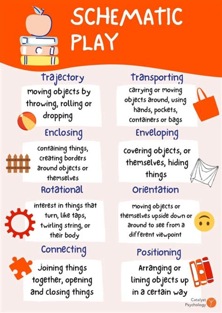 • Connecting. Children exploring this schema may show an interest in joining things together or tying things up, e.g. connecting train track pieces or Lego. ...
