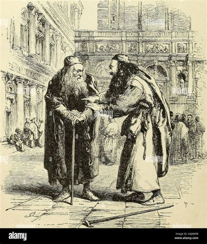 As he calculates the interest on Bassanio's loan, Shylock remembers the many times that Antonio has cursed him, calling him a “misbeliever, cut-throat, dog / And spit upon [his] Jewish gaberdine” (I. iii.