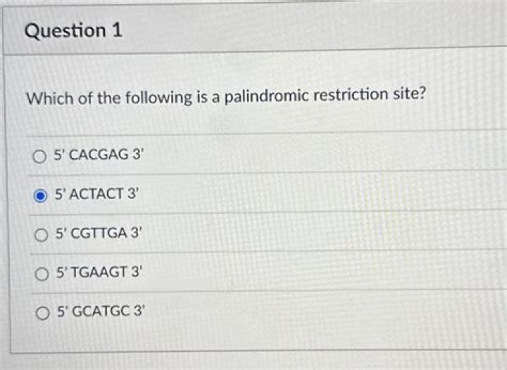 An example of which is 5' - GAATTC - 3'. It does not have the same sequence for the single strand but its 5' to 3' sequence is similar to the 5' to 3' sequence of its complementary strand. Therefore, from the given choices, a palindromic restriction site is D. 5' - ACGCGT - 3'.