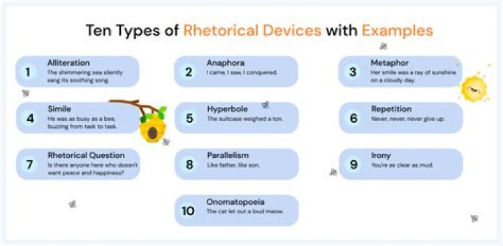 Repetition, figurative language, and even rhetorical questions are all examples of rhetorical devices. ... Another is alliteration, like saying "bees behave badly in Boston." Rhetorical devices go beyond the meaning of words to create effects that are creative and imaginative, adding literary quality to writing.