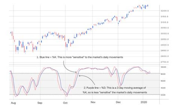 It shows momentum. Generally, traders would say that a Stochastic over 80 means that the price is overbought and when the Stochastic is below 20, the price is considered oversold. ... A high Stochastic means that the price is able to close near the top and it keeps pushing higher.