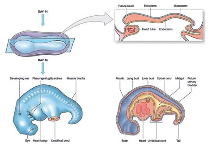 The heart forms from an embryonic tissue called mesoderm around 18 to 19 days after fertilization. Mesoderm is one of the three primary germ layers that differentiates early in development that collectively gives rise to all subsequent tissues and organs.