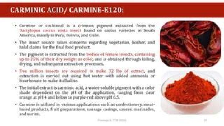 2.2. 9 Carminic acid/carmine. Carmine or cochineal is a well-established crimson pigment extracted from insects in South America. The insect source has connotations for the final food as it cannot be claimed to be vegetarian, kosher or halal.