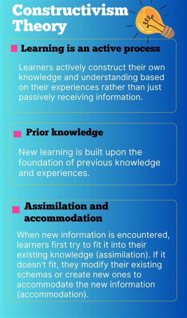 Constructivism is the theory that says learners construct knowledge rather than just passively take in information. As people experience the world and reflect upon those experiences, they build their own representations and incorporate new information into their pre-existing knowledge (schemas).