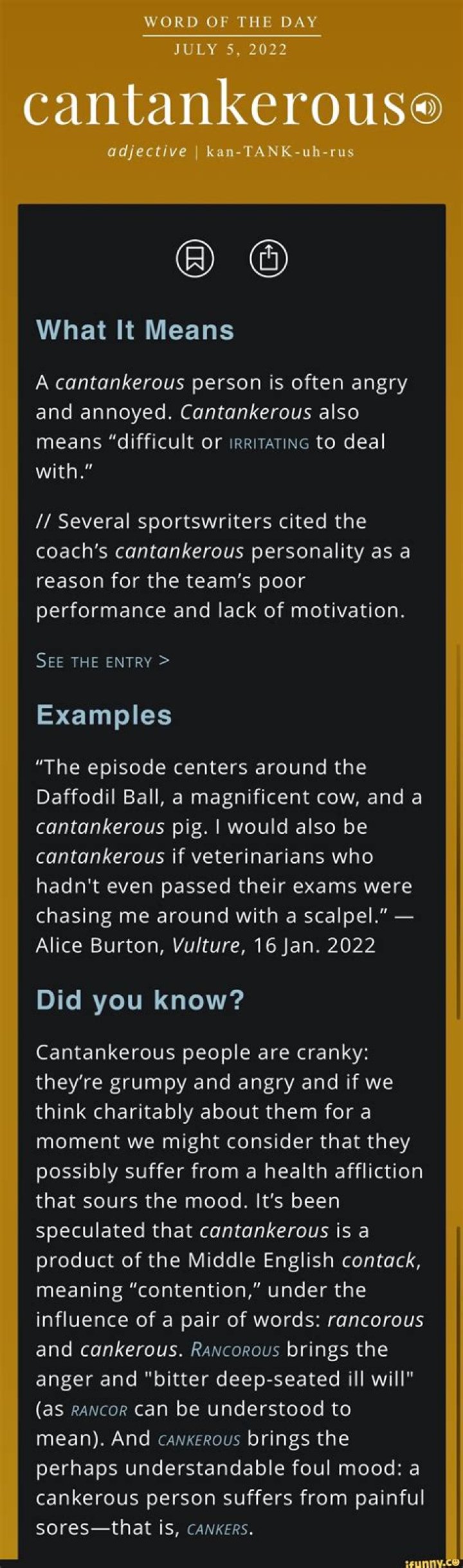 : difficult or irritating to deal with a cantankerous mule. Other Words from cantankerous Synonyms & Antonyms The Origin of Cantankerous Is Mysterious More Example Sentences Learn More About cantankerous.