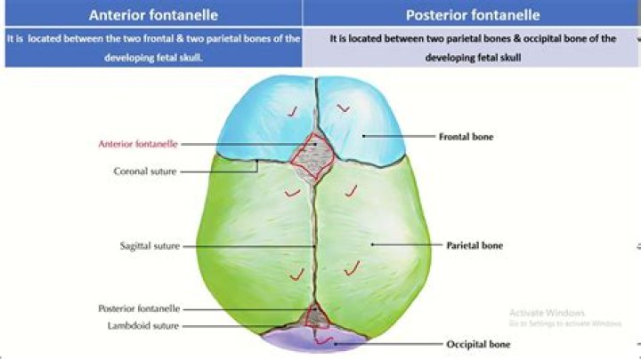 The normal anterior fontanelle (diamond shaped) in a newborn measures between 3 -4 cm long by 2 -3 cm wide. Located at the juncture of the frontal and parietal bones. Usually closes by age 18 months.