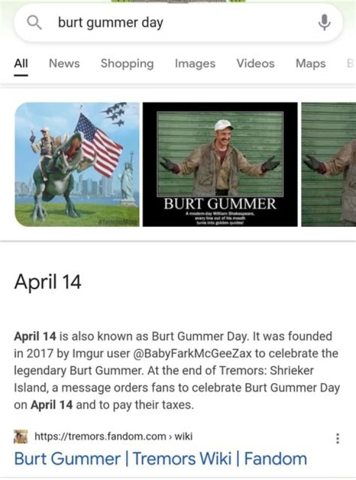 At the end of Tremors: Shrieker Island, a message orders fans to celebrate Burt Gummer Day on April 14 and to pay their taxes. As of the sixth film, Burt has trusted Travis with being his successor. By that point, Burt had reached his 60s and an adventurous life would be too much for him.