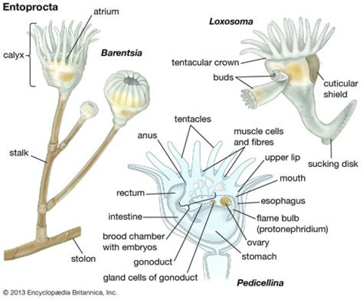 Bryozoans, phoronids and brachiopods strain food out of the water by means of a lophophore, a "crown" of hollow tentacles. Bryozoans form colonies consisting of clones called zooids that are typically about 0.5 mm (1⁄64 in) long.
