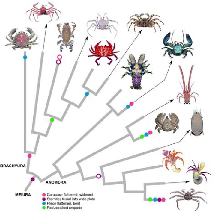 The telson is no longer functional in crabs, and the uropods are absent, having probably evolved into small devices for holding the reduced abdomen tight against the sternum. In most decapods, the gonopores (sexual openings) are found on the legs.