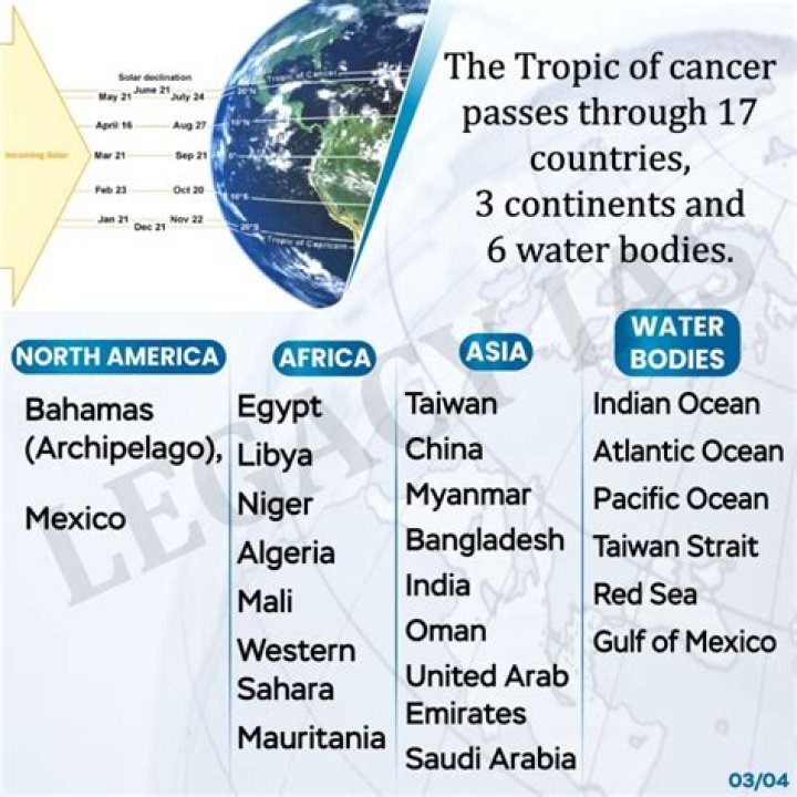 It cannot be seen because it's an imaginary line. Some countries through which the Tropic of Cancer passes are Libya, Niger, Saudi Arabia, UAE, India, the Bahamas and China.