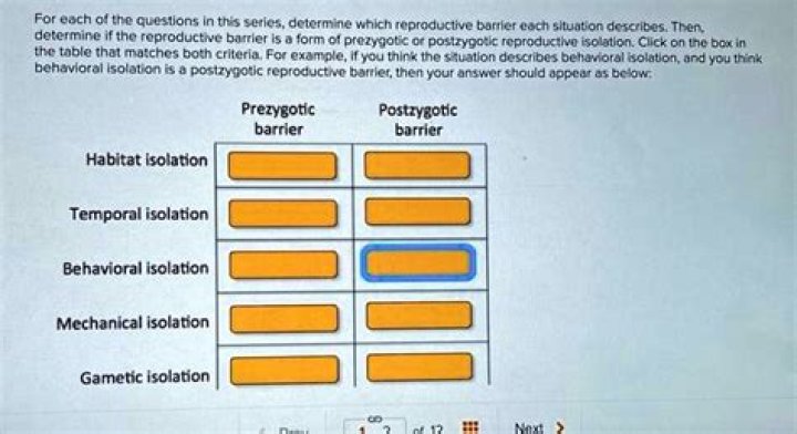 Prezygotic barriers prevent members of different species from mating to produce a zygote, a single-celled embryo. ... Two species might prefer different habitats and thus be unlikely to encounter one another. This is called habitat isolation.