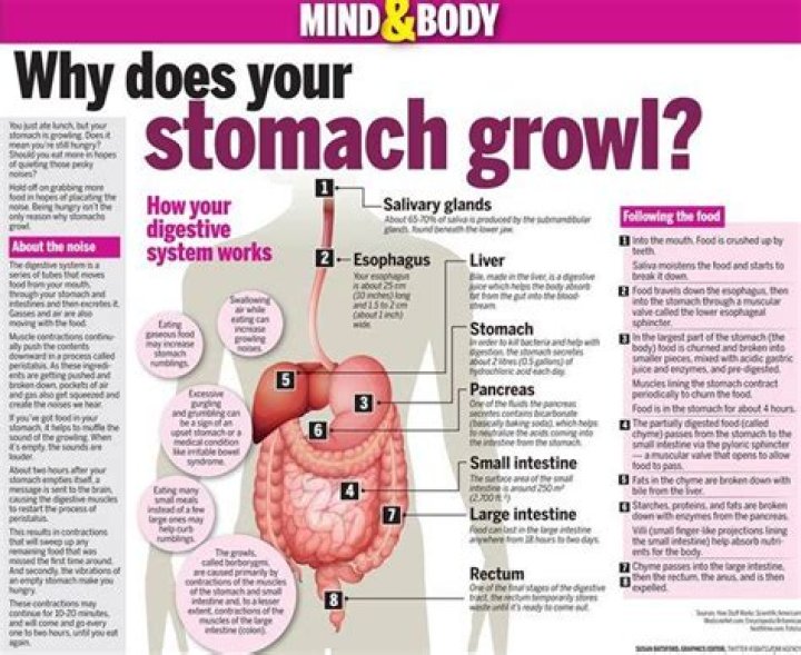 A common misconception is that a growling stomach means you're hungry, but this is usually not the case. As a matter of fact, the growling, gurgling or rumbling sounds you hear are coming from your small intestine or colon, not your stomach.