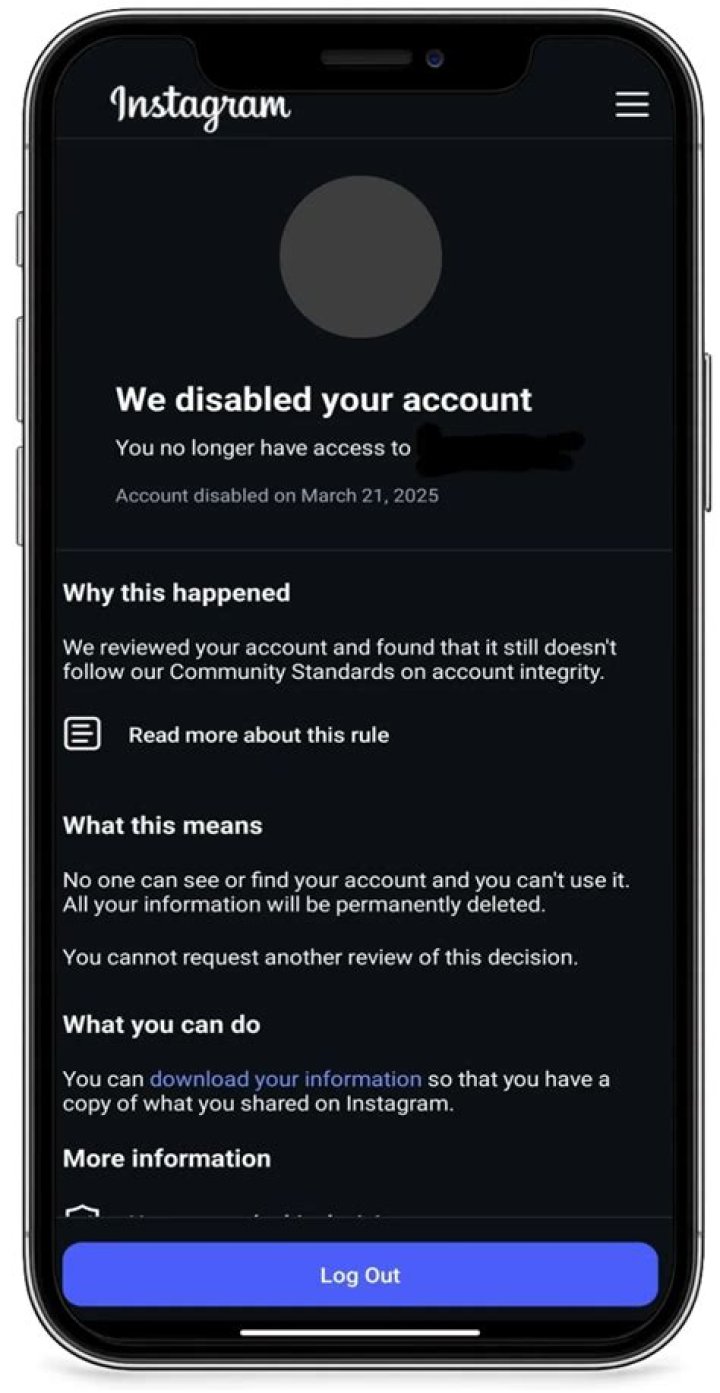 Accounts that don't follow our Community Guidelines or Terms of Use may be disabled without warning. We suggest that you review the Community Guidelines carefully along with the posts on all accounts you've created.