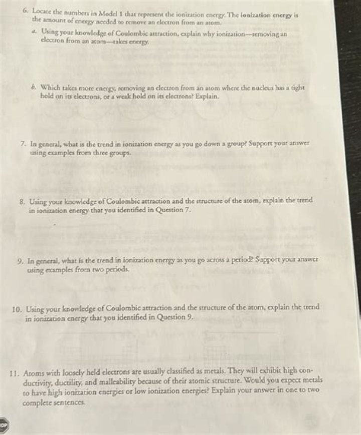 Explain your answer in one to two complete sentences. Because of the loose hold, I would expect metals to have a low ionization energy because it is easier to remove an electron. ... As you go down a group, the increase in amount of energy levels decreases the Coulombic attraction within the atom.